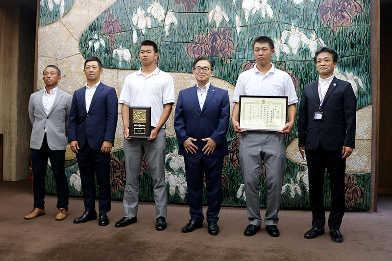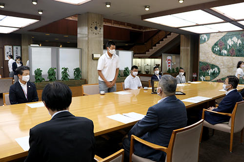 この日県公館を訪問したのは今大会にも出場した印出太一主将(3年)と髙橋宏斗選手(3年)、また硬式野球部の高橋源一郎監督、今村陽一部長と附属高校の伊藤正男校長。印出主将は「なかなか良いニュースが少ない中で、愛知県の皆さんに勇気や感動を与えられるよう1試合1試合積み重ねた結果が、優勝という形になったのだと思います」と振り返り、髙橋選手は「公式戦無敗という形で高校野球を締めくくることができましたが、それは多くの人に支えられてきた結果だと思います。感謝を忘れず今後の野球人生に活かしていきたいです」と力強く語った。