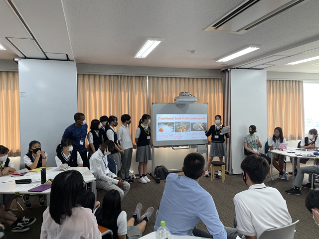1・2年生の混合グループで協力しながら、世界各国の留学生とあらゆるテーマについて話し合いました。日々学んでいる英語を使う実践の場として、「言いたいことをうまく伝えられない!」という状況に悪戦苦闘しながらも、一生懸命試行錯誤しながら留学生と交流する姿が見られました。