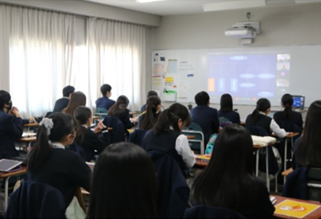 奥村さんは、韓国ソウルからリモートで出演され、「外務省について」「大使館での仕事」「皆さんへのメッセージ」というテーマで、高校生にも聞きやすいようアットホームな雰囲気でそれぞれの内容をわかりやすく伝えてくださいました。講演の途中では外務省を題材にしたクイズもあり、教室が笑いに包まれる場面も見られました。