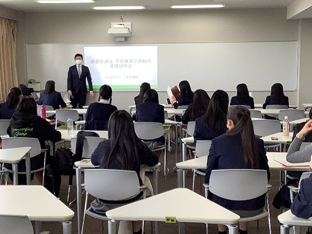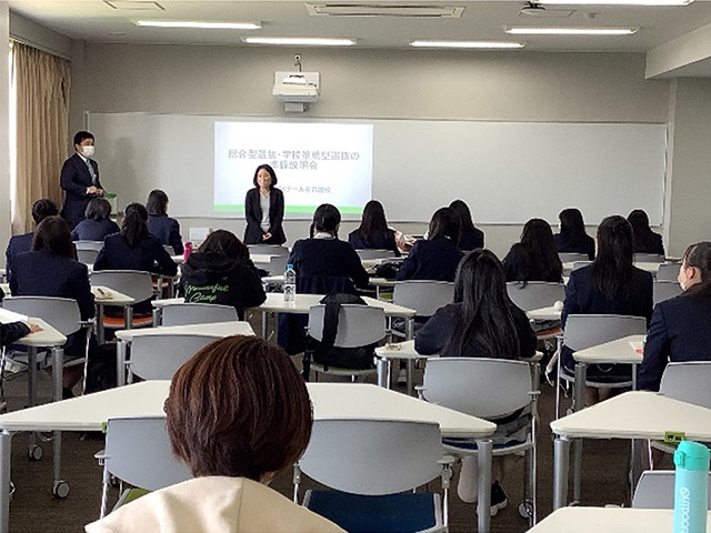 学校行事 【国際コース】学校推薦型選抜・総合型選抜対策説明会 3月16日(水)に、トフルゼミナールより講師を招き、国際コース1・2年生の希望者と保護者対象に「学校推薦型選抜・総合型選抜対策説明会」を実施しました。 多様化する入試の仕組みや特徴、受験のタイムスケジュール、準備すべきことの説明を詳しく聞きました。視野を広げてさまざまな大学の特徴を調べ、自分のやりたいことや強みをしっかり考えて準備を進めていく意識付けとなる有意義な機会となりました。