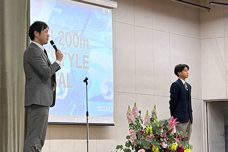 激励会では全校でレース映像を見ながら、水泳部顧問の竹内先生から解説・村佐さんの紹介をしていただきました。